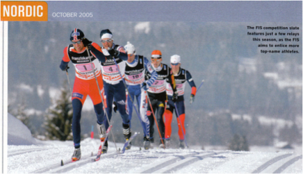 2005 – Photograph of Cross-Country ski racers with long Nordic-style poles. Paul Robbins, “Looking to Score with Tour,” Ski Racing, 38, 3 (November 2005), 38